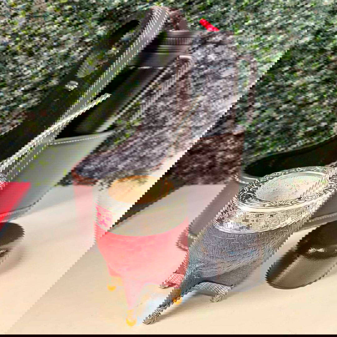 Mate Imperial PREMIUM de calabaza, Virola Alpaca CINCELADA, Cuero CROCCO, Base REFORZADA Alpaca, Bolitas en Bronce, Termo media manija 1L. Color Negro, Canasta Matera CHARRÚA, 100% CUERO Premium. Color Marrón y Bombilla Pico de loro Lisa ACERO.