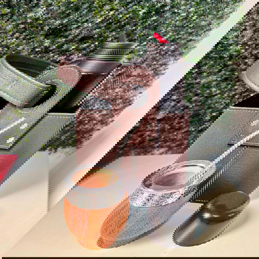Mate Imperial ALGARROBO, Virola Alpaca LISA, Termo media manija 1L. Color Negro., Canasta Matera, ECO Cuero PREMIUM, Color marrón y Bombilla Pico de loro Lisa ACERO.