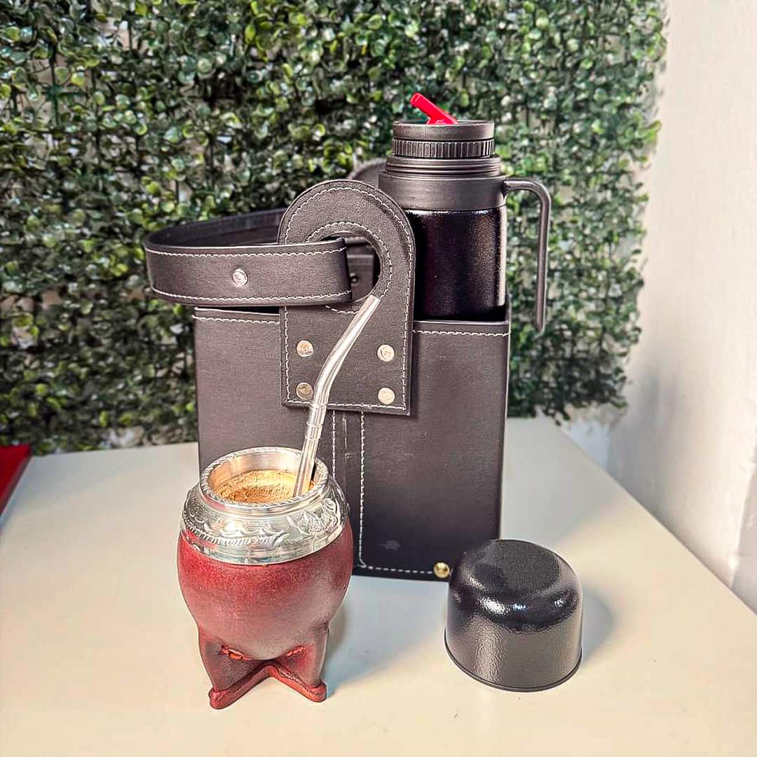 Mate Torpedo PREMIUM de calabaza JOYERO, Virola Alpaca CINCELADA, Cuero LISO, Termo media manija 1L. Color Negro., Canasta Matera, ECO Cuero PREMIUM, Color negro y Bombilla Pico de loro Lisa ACERO.