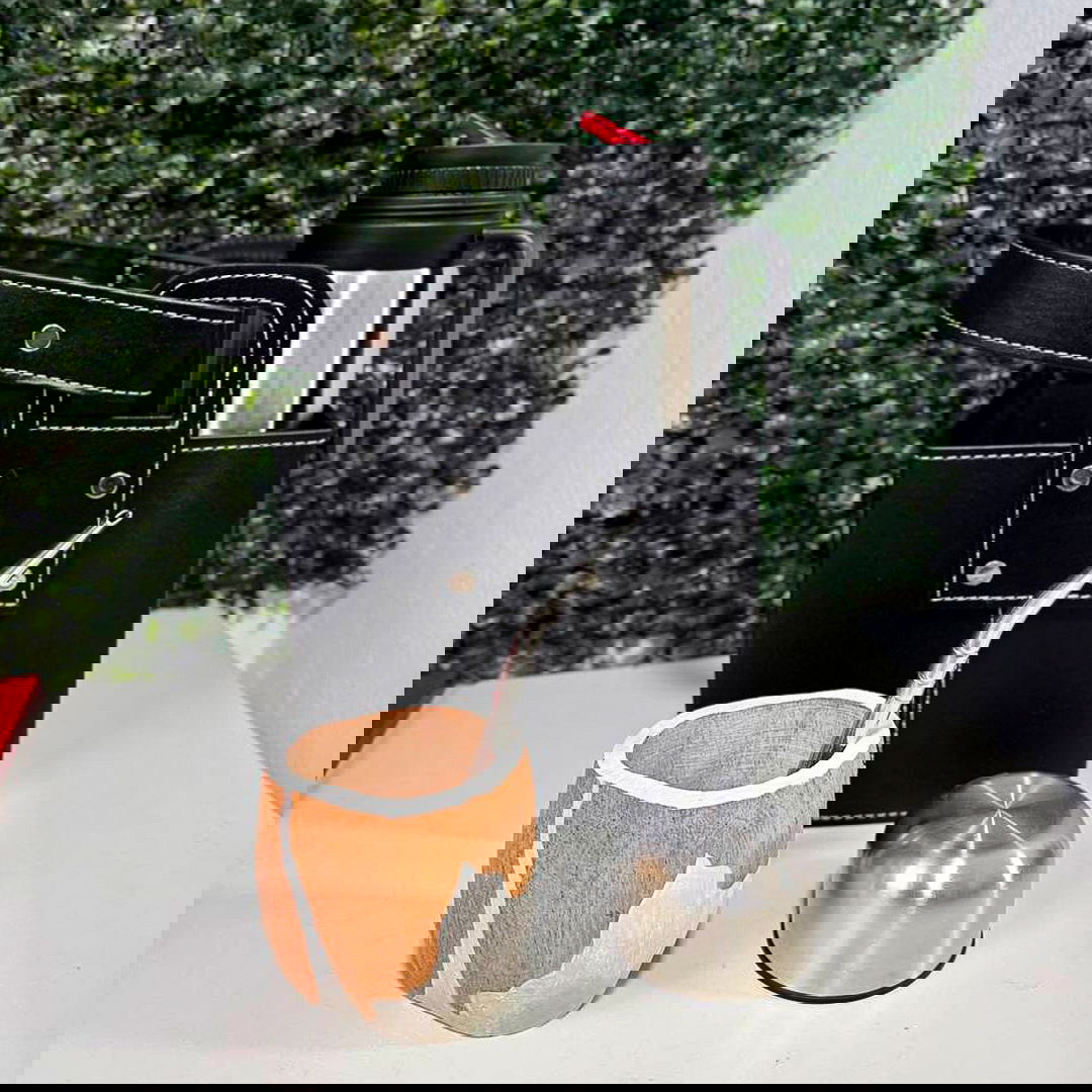 Mate de ALGARROBO, pintado a mano Artesanal, Termo media manija 1L., Canasta Matera, ECO Cuero PREMIUM, Color negro y Bombilla Pico de loro Lisa ACERO.