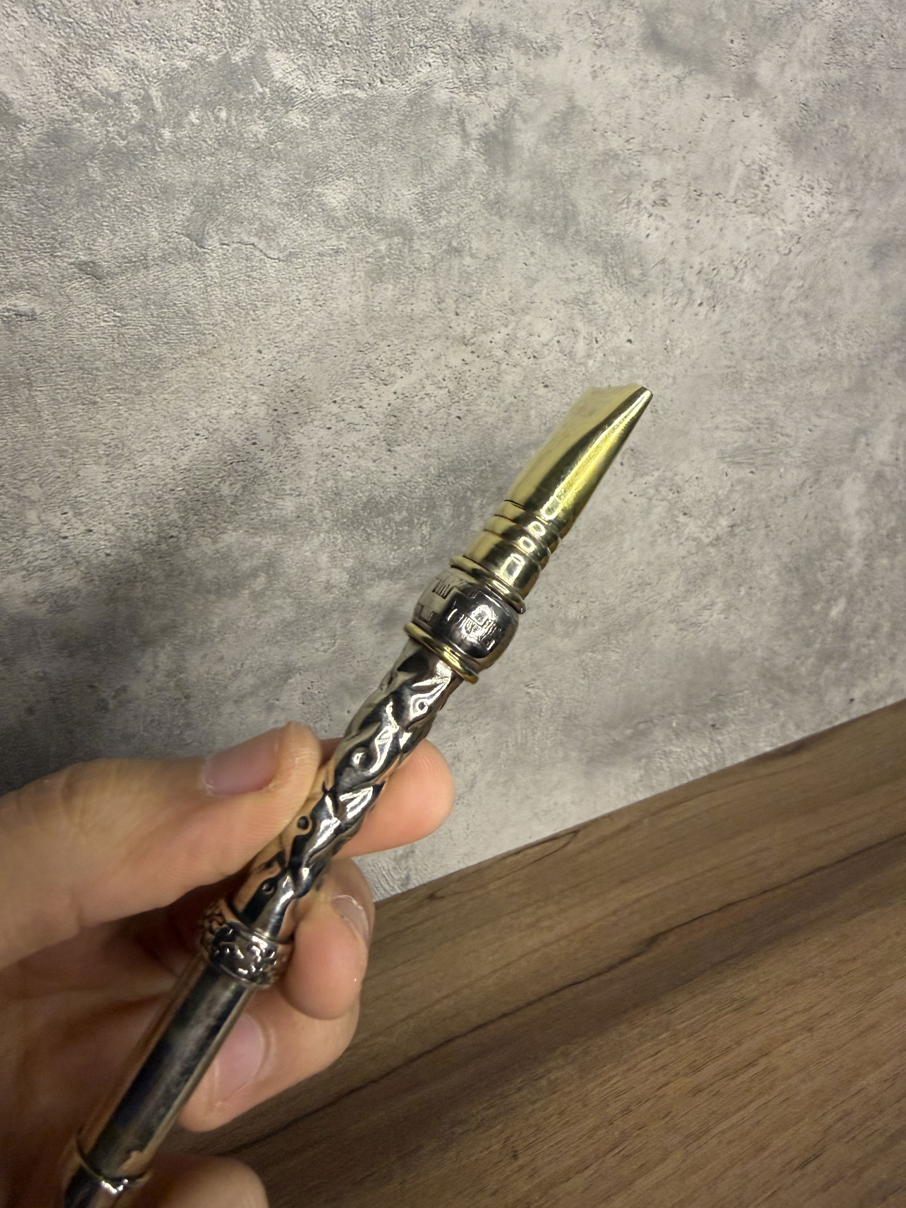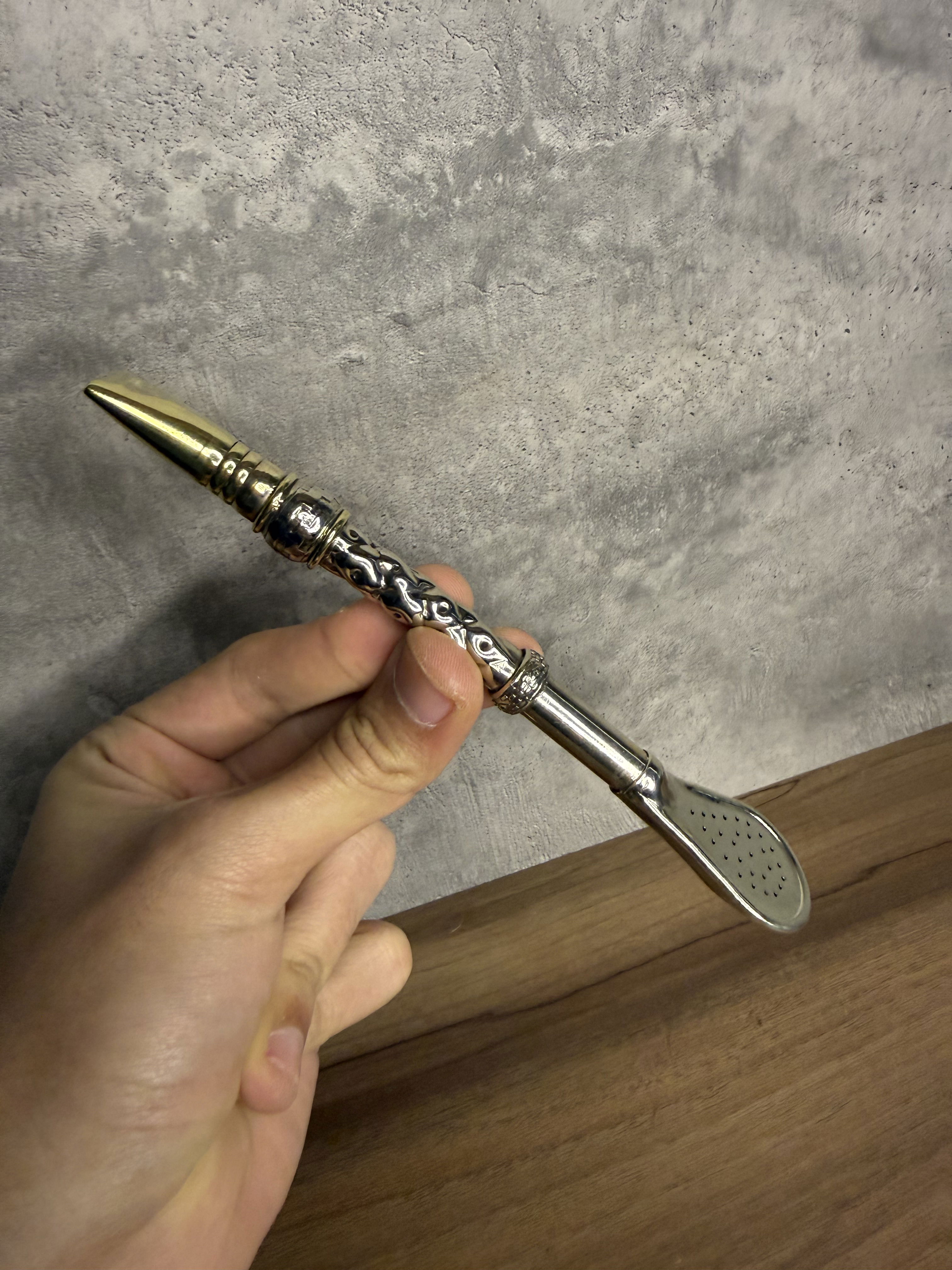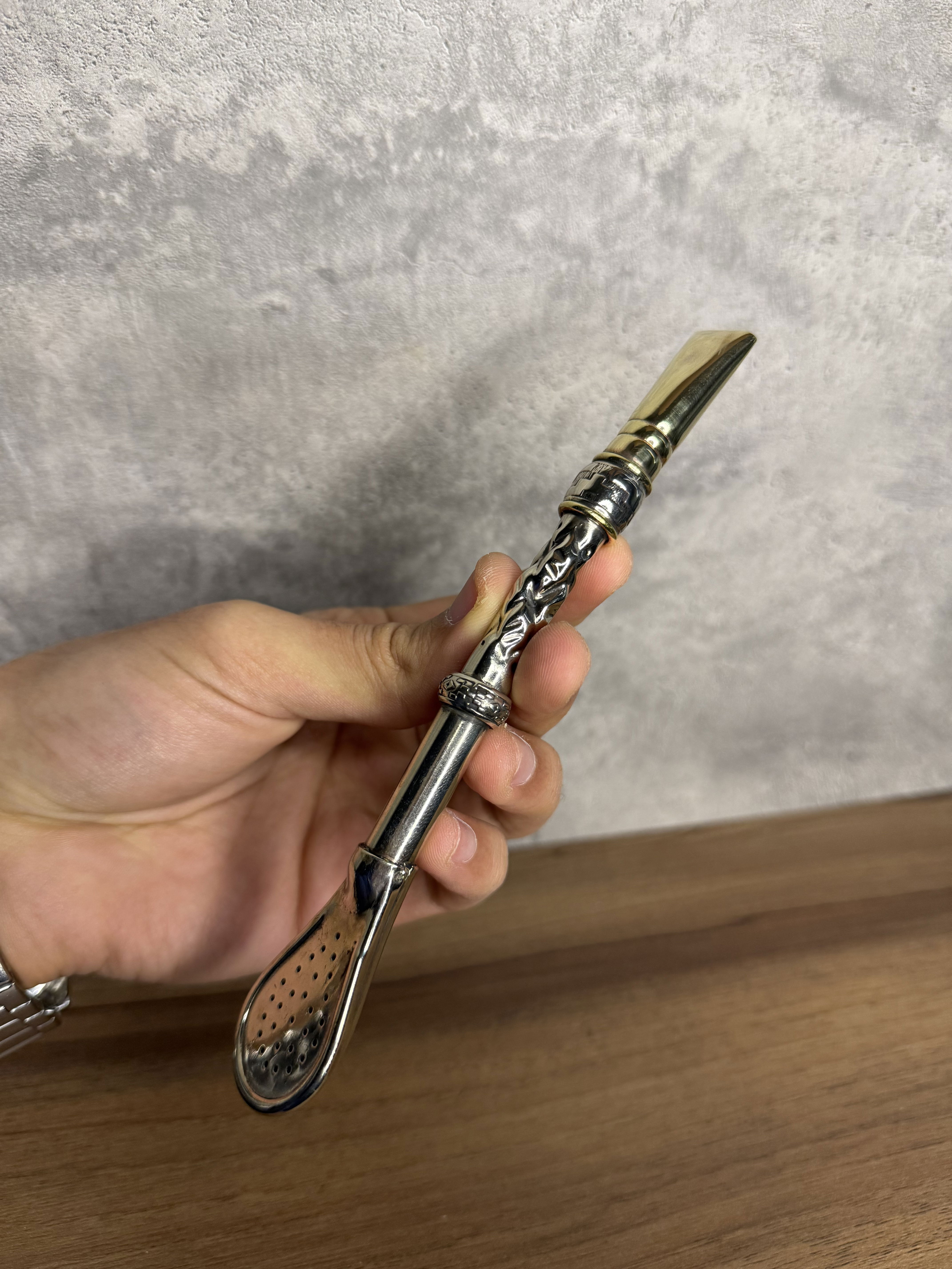 Bombillón Alpaca maciza Cincelado Artesanal, SEMI Curvo, Pico y detalles en Bronce.