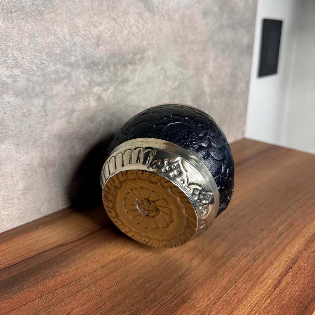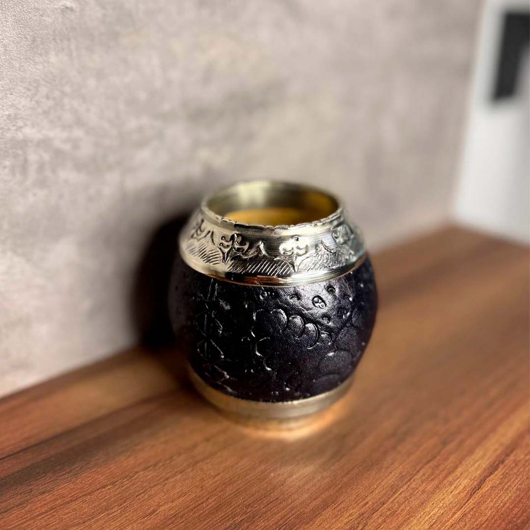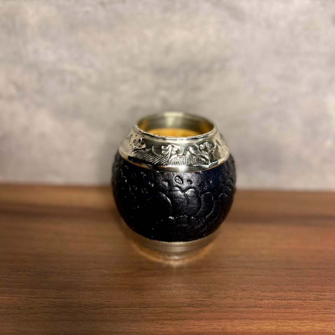 Mate Torpedo ROMA EXCLUSIVO de calabaza, Virola Alpaca CINCELADA, Cuero TALLADO, Base Alpaca Cincelado ARTESANAL.