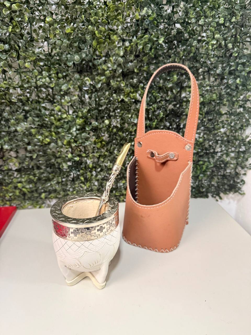 - Mate Imperial PREMIUM de Calabaza, Virola Alpaca Cincelada, Cuero TALLADO, color BLANCO.