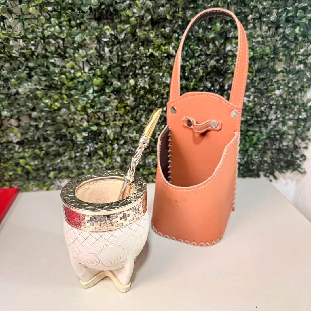 Mate Imperial PREMIUM de Calabaza, Virola Alpaca Cincelada, Cuero TALLADO, color BLANCO.