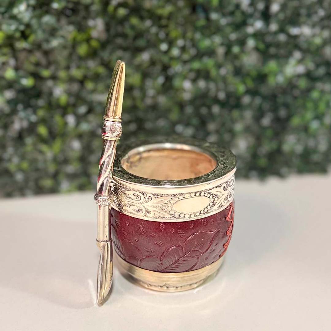 - Mate imperial ROMA EXCLUSIVO de calabaza, Virola Alpaca CINCELADA, Cuero TALLADO, Base Alpaca Cincelado ARTESANAL.