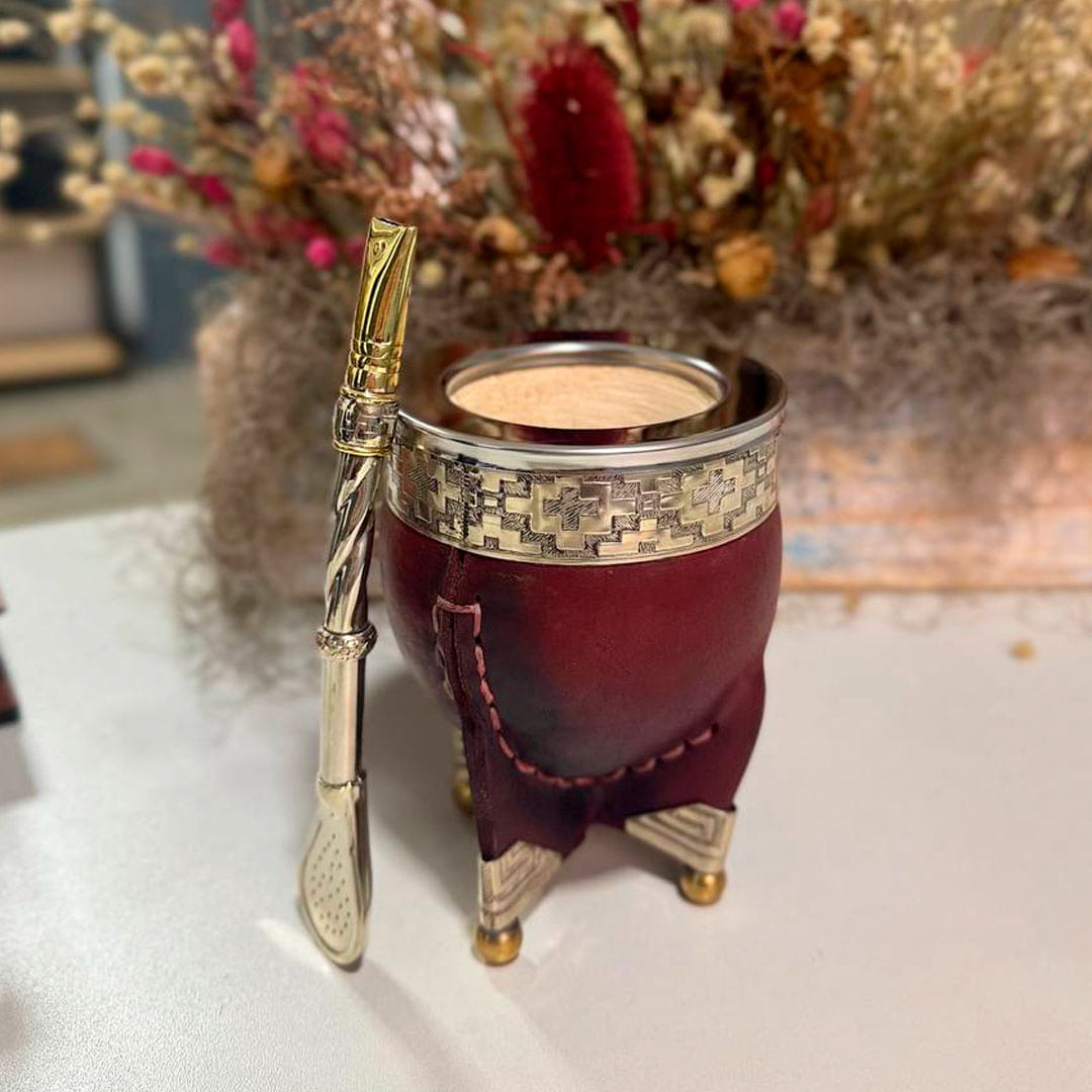 - Mate Imperial PREMIUM de Calabaza, COMBINADO Virola Acero Lisa, Guarda de Alpaca, Cuero LISO y Esquinero de alpaca bolitas en Bronce.